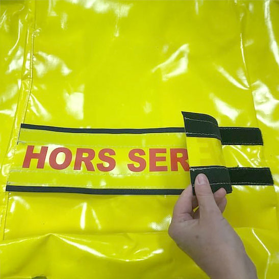 Le format standard de la housse est de 82 cm de hauteur x 44 cm x 38 cm, équipée d’un scratch avec texte amovible. Vous avez le choix entre plusieurs options de texte à fixer, telles que “HORS SERVICE,” “SUPPRIMÉ,” “A CONTROLER,” mais aussi “PROBLEME DE DEBIT,” pour indiquer clairement l’état de la borne incendie.