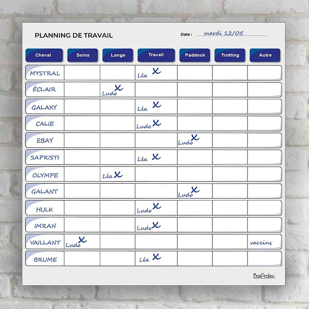 Fabriqué en PVC ou en aluminium composite, notre planning d’entraînement est résistant et durable. Il peut être personnalisé avec les noms de vos chevaux. Le reste, ce n’est que des cases à cocher ! Grâce à sa surface effaçable, vous pouvez modifier le planning à volonté.