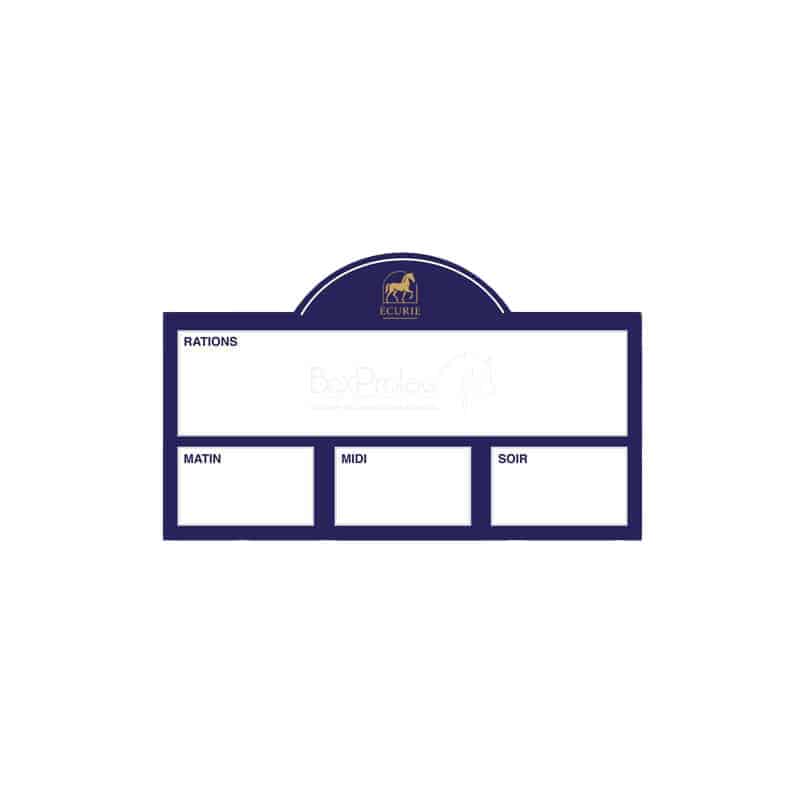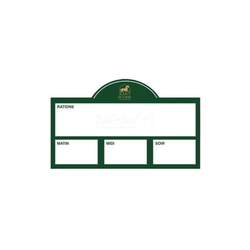 Organisez facilement les repas de vos chevaux matin, midi et soir ! Les plaques de ration à personnaliser Boxprotec sont équipées d’un revêtement effaçable conçu pour une utilisation avec des feutres effaçables, garantissant une gestion facile et rapide au quotidien.