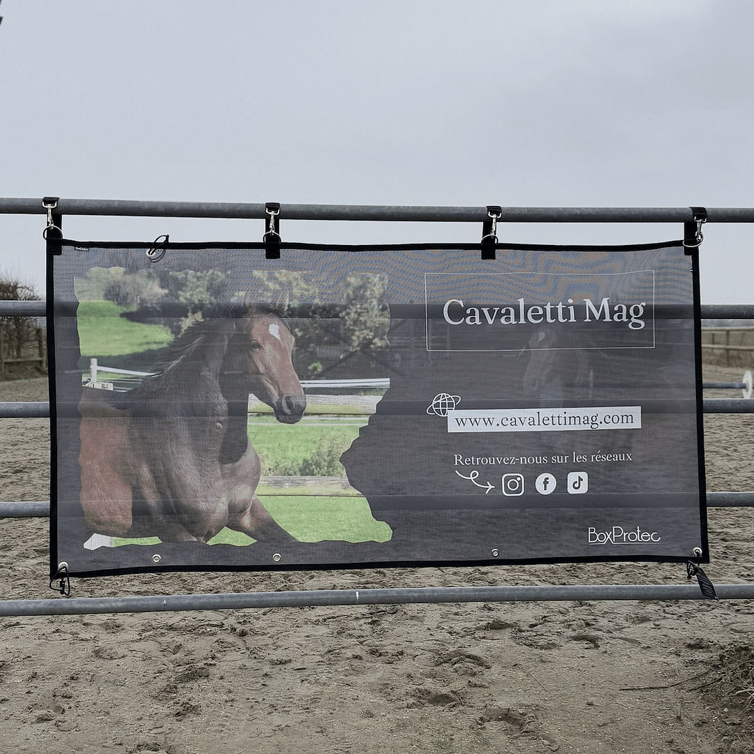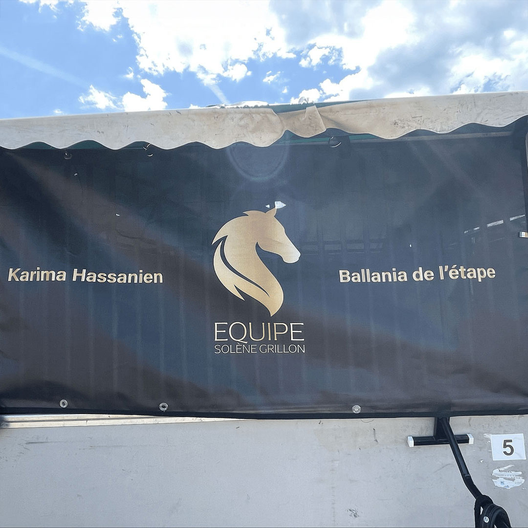 Ajoutez votre nom, celui de votre cheval, un logo, une photo ou même vos couleurs d’écurie. Un excellent moyen de marquer votre espace et de valoriser votre image en concours.
